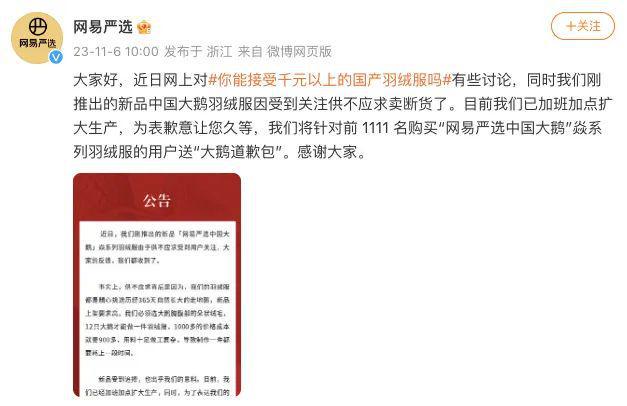 11月6日上午,网易严选官方发布公告表示,虽然羽绒服要上千元,但原料成本就要花掉900多元、制作工艺复杂且新品上架要求高,导致上架没多久就因供不应求卖断货。为了向购买预售产品的消费者表示道歉和感谢,他们将对此作出补偿。由此,关于国货的定价问题,再次引发了网友讨论。